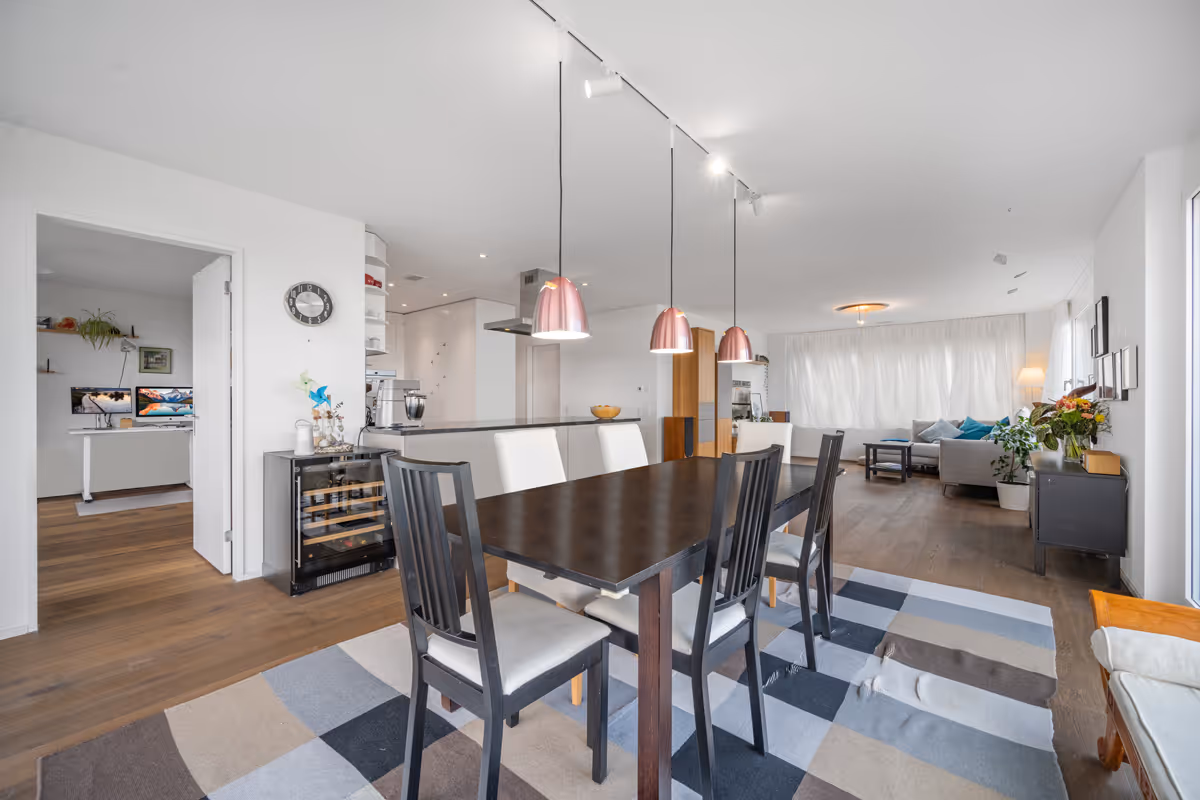 Mit über 130m² Wohnfläche bietet diese Wohnung grosszügig geschnittene, lichtdurchflutete Räume, die alle mit hochwertigem Parkettboden und elektrisch bedienbaren Rollläden ausgestattet sind. Der große Balkon lädt zum Entspannen im Freien ein. Eine moderne AV-Installation, eine eigene Waschmaschine und ein Trockner sowie eine geräumige Küche mit Bar und zeitgemässen Geräten vervollständigen das Angebot.